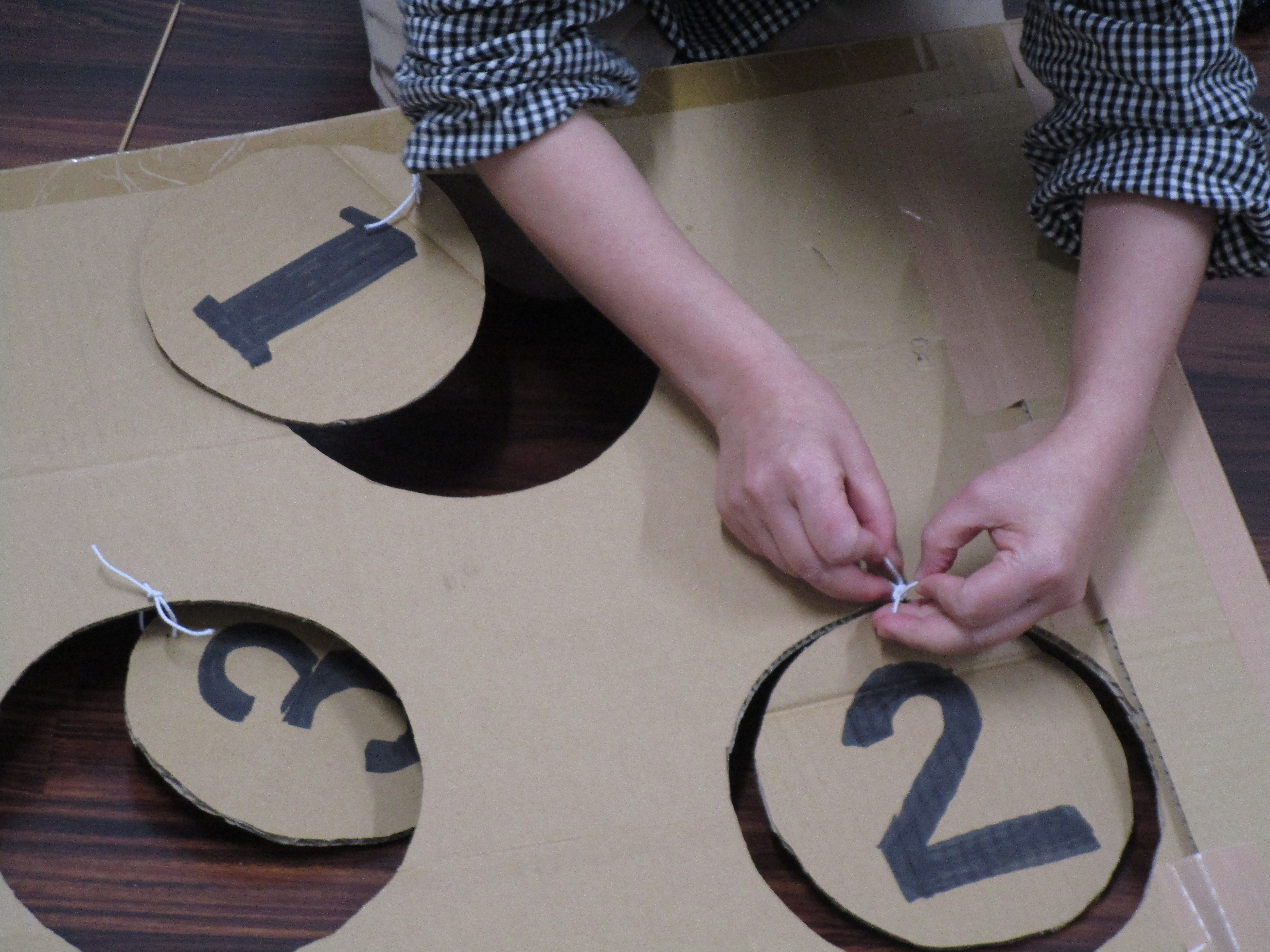 | 2018ロシア ワールドカップ!! がんばれニッポン!! キックターゲット!! | |  | |  | じゅんびするもの 広めの段ボール箱 布テープ カッター はさみ ひも 新聞紙(チラシ) 風船 テープ つくりかた #1 段ボール箱を切り開いて、段ボール板にする #2 折り目の部分は段ボールを当て補強する #3 3か所、ボールの通る大きさの穴を空ける #4 穴を空けてできた円形の段ボールを一回り小さく 切る(3つ全部) #5 #4に数字を書いて、上部に小さく穴をあけひもを 通す #6 穴に数字を書いた段ボールを下げる #7 段ボール板の下部に、別の段ボールを合わせテープで固定させる(後ろ側を少し斜めにカットする) #8 風船を膨らませ、帯状に折ったチラシを風船にかけてテープでとめる あそびかた 離れたところから、ターゲットを目がけてボールを蹴ります。 いくつターゲットをゲットできるかな? がんばれニッポン!! | | | |  |