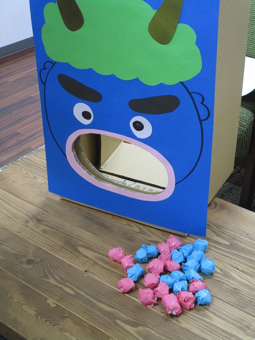 チームに分かれて、鬼の口にどちらがたくさん豆を入れるか競争です