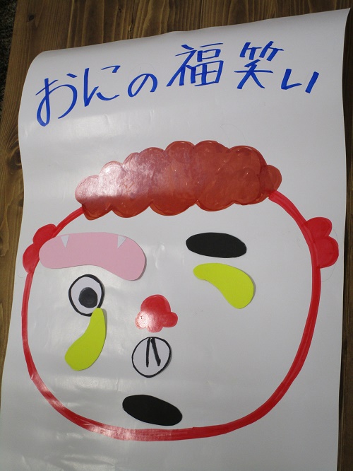 目隠しをして、福笑いを楽しむ。鬼さんだけど福笑い!! | | | |  |