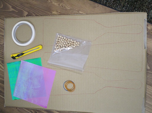 |  | |  | じゅんびするもの 段ボール(又は厚紙) 大豆(4〜5)→(無ければペットボトルのキャップなど) 折り紙(ポリ塩化ビニル製)→張りのある素材 輪ゴム 両面テープ