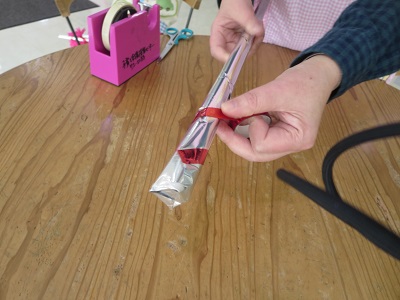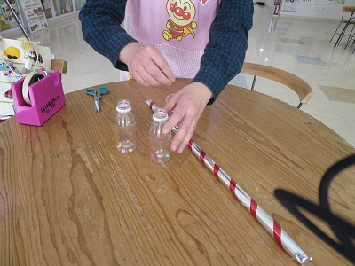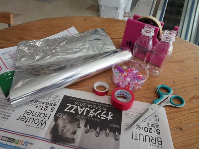 |  | |  | じゅんびするもの 新聞紙(一日分) 乳酸飲料の空容器(2) 内側が銀色のお菓子の袋 テープ ビーズ キラキラテープ(棒の部分に巻く)