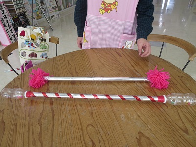 つくりかた 1) 内側が銀色の袋を、縦長にリボン状に切る 2) 新聞紙を棒状に丸め、棒の先端をテープでとめる 3) 新聞紙の棒に、リボン状に切った銀色の袋を巻き付ける 4) 棒にらせん状にテープを巻く 5) 乳酸飲料の容器の中にビーズを入れ、棒をそれぞれ差し込みテープでしっかり止める 暖かい日差しの中で、からだを思いっきり動かしてあそんでみよう!! 棒の先に、毛糸のボンボンを付けてみても楽しいですね!