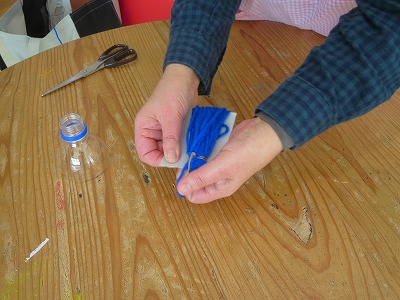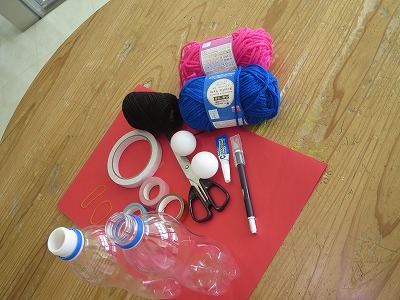 |  | |  | じゅんびするもの ペットボトル(500ml×2本) 画用紙 毛糸(ピンク・ブルー) はさみ 両面テープ ピンポン玉(2) 毛糸(黒) 輪ゴム 瞬間接着材