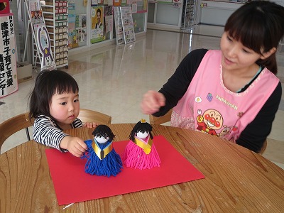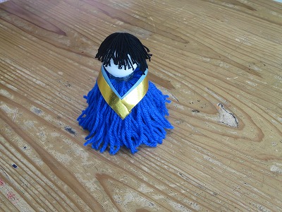 つくりかた 1)ペットボトルの飲み口から、10センチくらいのところで切り取る 2)毛糸で10センチ大に巻き、輪ゴムで縛り、ボンボンをつくる 3)ペットボトルに、毛糸のボンボンをつける 4)黒糸の毛糸で、ボンボンをつくる 5)ピンポン玉に両面テープで、黒糸のボンボンを乗せ、付ける 6)髪をつけたピンポン玉を本体のペットボトルに、接着剤でつける 7)えりをつける 8)杓をつける 9)女雛も同じようにつくる