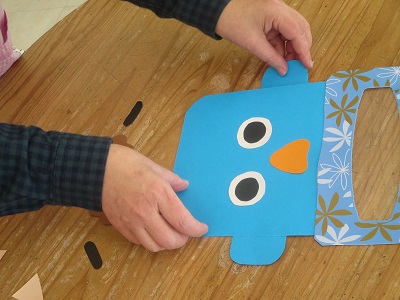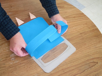 5)耳の部分に、頭にかぶれるように、輪ゴムをつけます