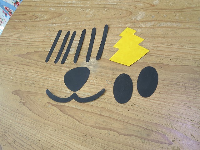 3) 厚紙に唐ワンくんの顔、兜のかざりなどパーツを描き、色を塗る