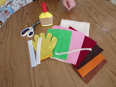 |  | |  | じゅんびするもの 軍手(あればカラー軍手やてぶくろ) フェルト はさみ 木工用ボンド おはなしに合わせて、キャラクターを指先に付ける 今回のおはなしは、三匹のこぶた