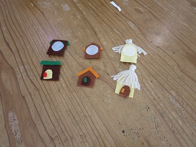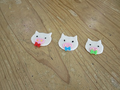 つくりかた 1) ぶたのかおをフェルトで作る(3ひき) 2) おおかみのかおをフェルトで作る 3) 家(わら・木・石)をフェルトでつくる 4) こぶた・おおかみ・家の後ろ側に、マジックテープをつける 5) 指の先にマジックテープをつける 6) 家はおはなしに合わせて、付け変えていく