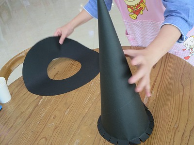 つくりかた 1) 黒色の画用紙で三角垂をつくる 2) 画用紙を円形に切る(帽子のつばになる、2枚) 3) 円形の中心を丸く切り抜く(2枚) 4) 三角垂の底辺の部分に切り込みを入れる 5) 円形に切り抜いた部分に、三角垂を貼り合わせる 6) 貼り終えたら、その上にもう1枚の円形を貼る 7) 帽子の部分にオレンジ色の画用紙を、リボンのように貼る