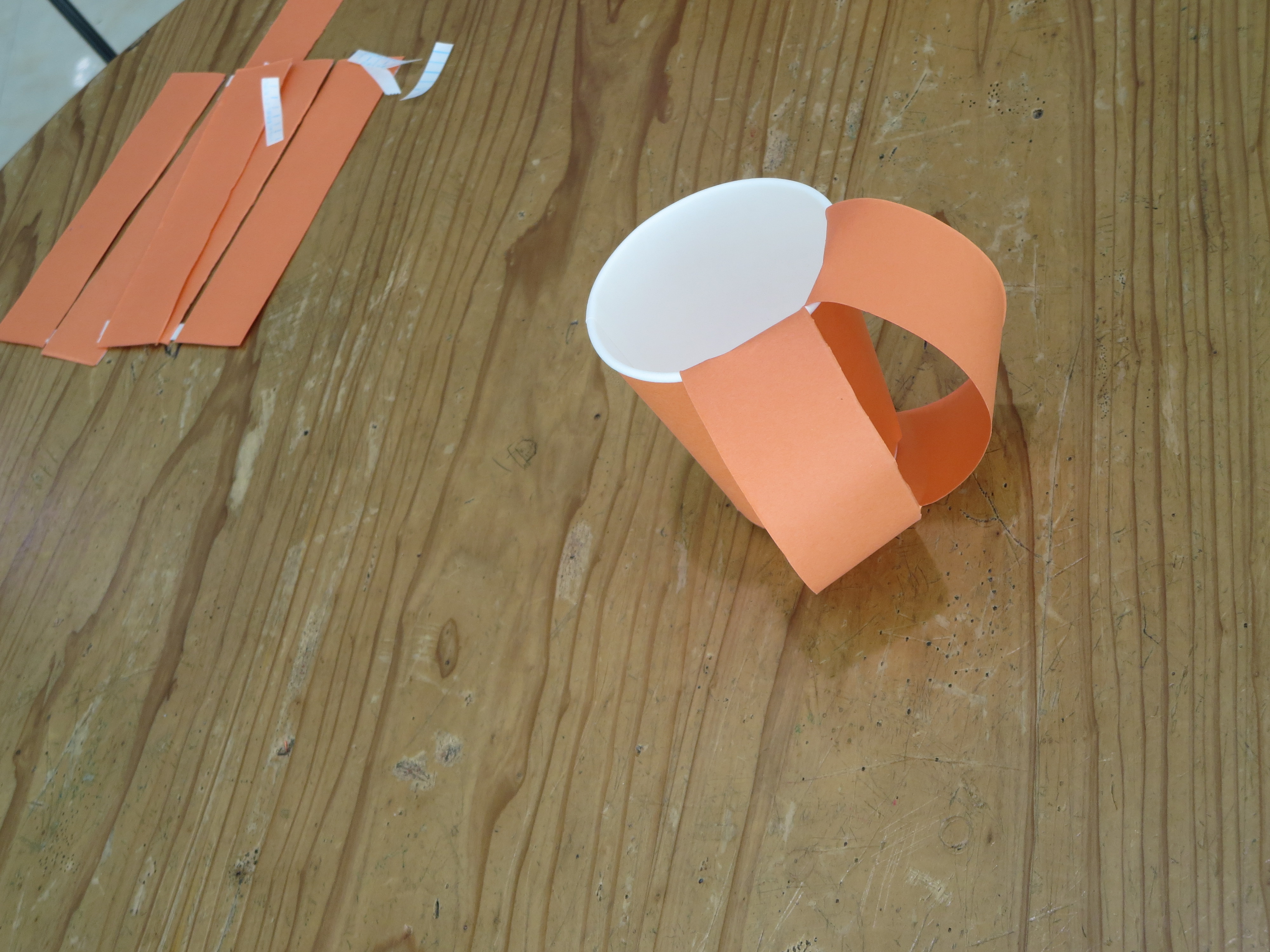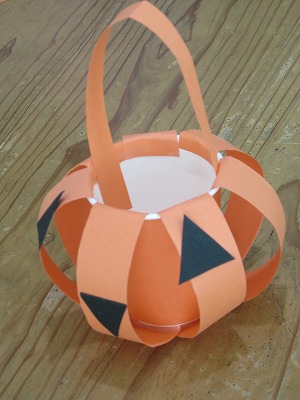 つくりかた 1) 紙コップの周りに、オレンジ色の画用紙を貼る 2) オレンジ色の画用紙を、長方形に切る 3) 紙コップの上下に、長方形に切った画用紙を丸くなるように貼っていく 4) 黒色の画用紙で、目や鼻をつくり貼る 5) コップには、お菓子を入れる | | | |  |