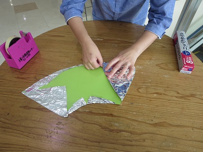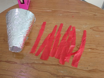 それぞれのじゅんびするもの アルミホイルの芯 赤色の紙 新聞紙 段ボール 輪ゴム リボン はさみ セロハンテープ