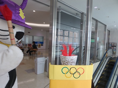 | リオオリンピック・パラリンピックをもう一度 聖火リレー・重量上げ・新体操(リボン)をやってみよう!! | |  | |  | 1 聖火リレー(トーチ)と聖火台 作り方1 アルミホイルの芯に、模様を描く(リオオリンピックの模様) 2 芯の片側の、赤色の紙で炎を付ける 1 段ボールで聖火台を作る 2 赤色の紙で炎をつける 3 下から、風を送る
