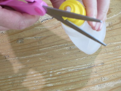 つくりかた 1) 容器の底の部分をカッターで切り、底を取り除く 2) 容器の先の部分も、小さい口の方を切り取る 3) マジックテープのループ側(硬い方)を、厚紙に貼りつける 4) 丸ひもを適当な長さに切り、ひもの先にテープを巻く