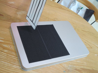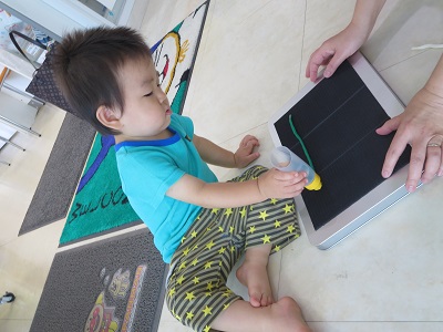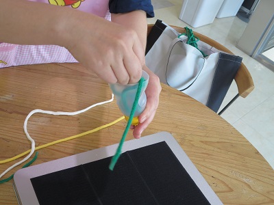 あそびかた 1) 容器の底側からひもを入れ、容器の口に少し出す 2) 口から出たひもを指で、押さえながらペンを持つように容器を持つ 3) マジックテープを貼った台に、ひもの先をあて静かに手を動かす 4) マジックテープにひもがひっかかり、絵を描くことができます 5) マジックテープなので、やり直しは自由。容器を使わず、手で直接ひもをマジックテープの台に並べて、絵を描いてもいいですね。