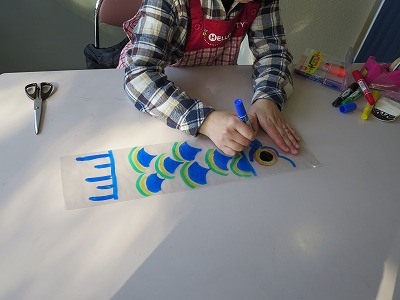 2) ビニールにこいのぼりの絵を描く(目やうろこなど)
