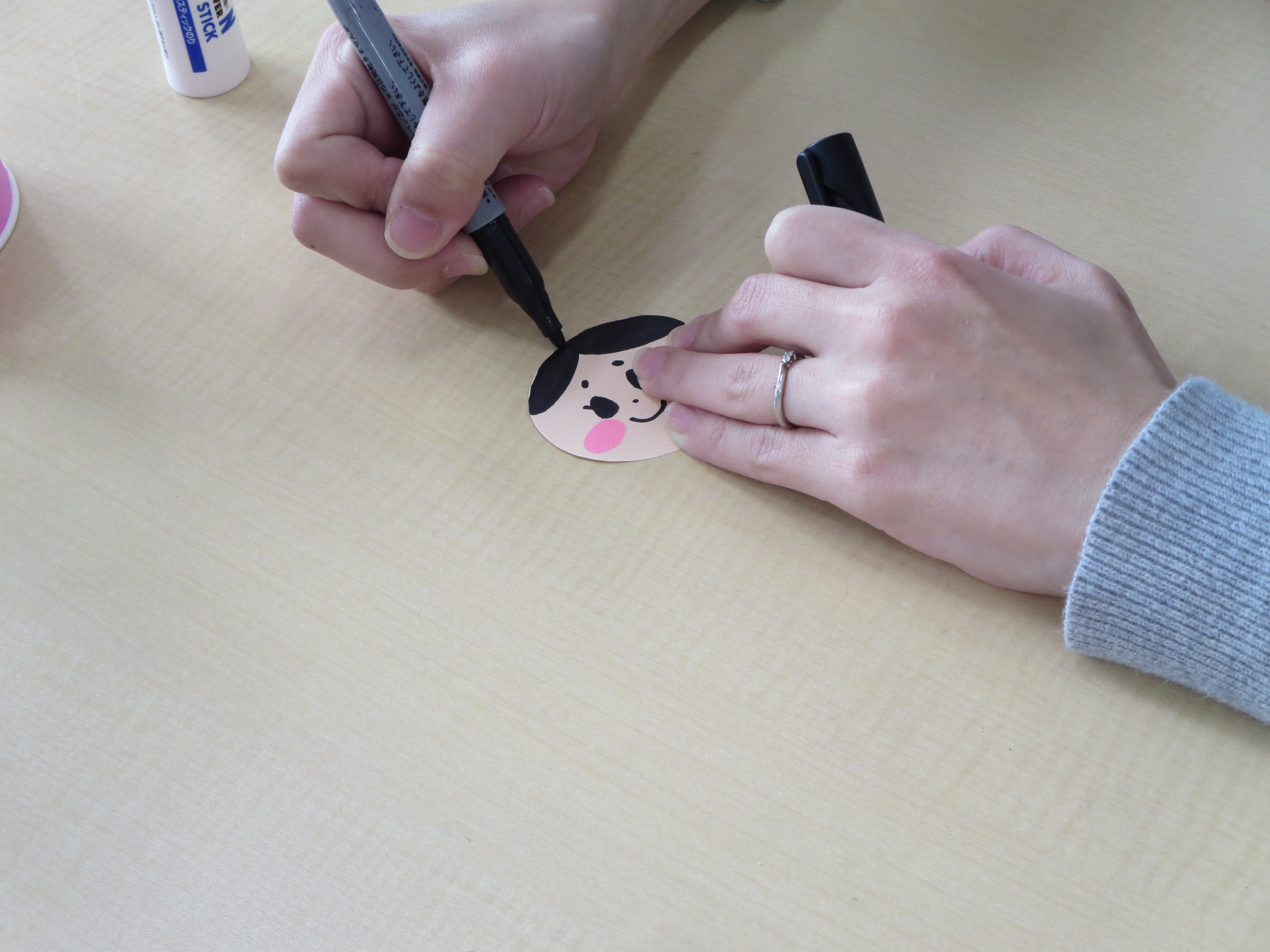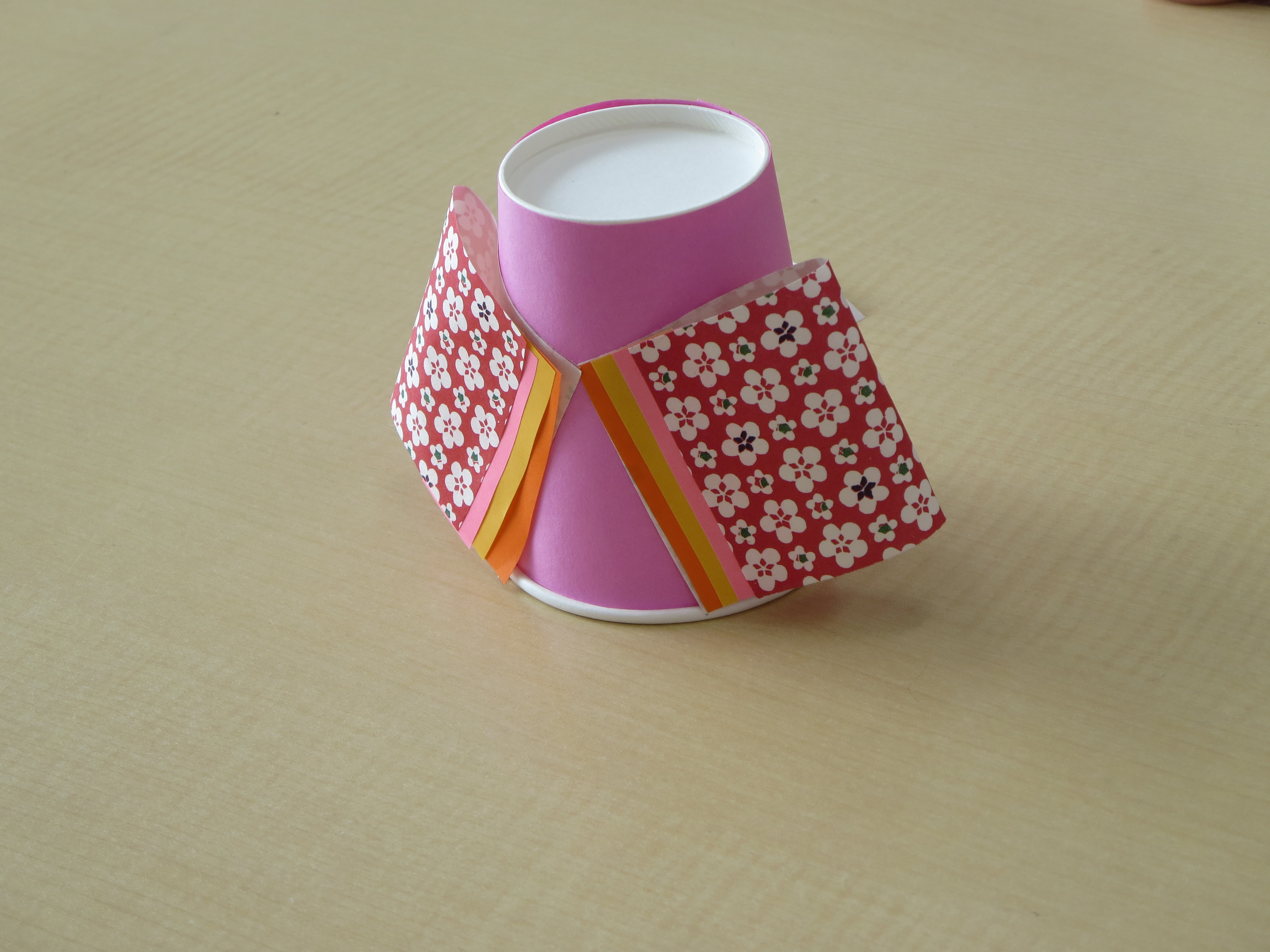 1)紙コップに色画用紙をまき、のり付けする。 2)和紙の折紙と色折紙を少しずつずらして、貼り合わせる。 3)2)を輪にして、袖の形にする。 4)本体のコップに、3)をのり付けする。 5)画用紙におひなさまとおだいりさまの顔を描く。 6)本体のコップに顔を付ける。 7)杓と扇を付ける。