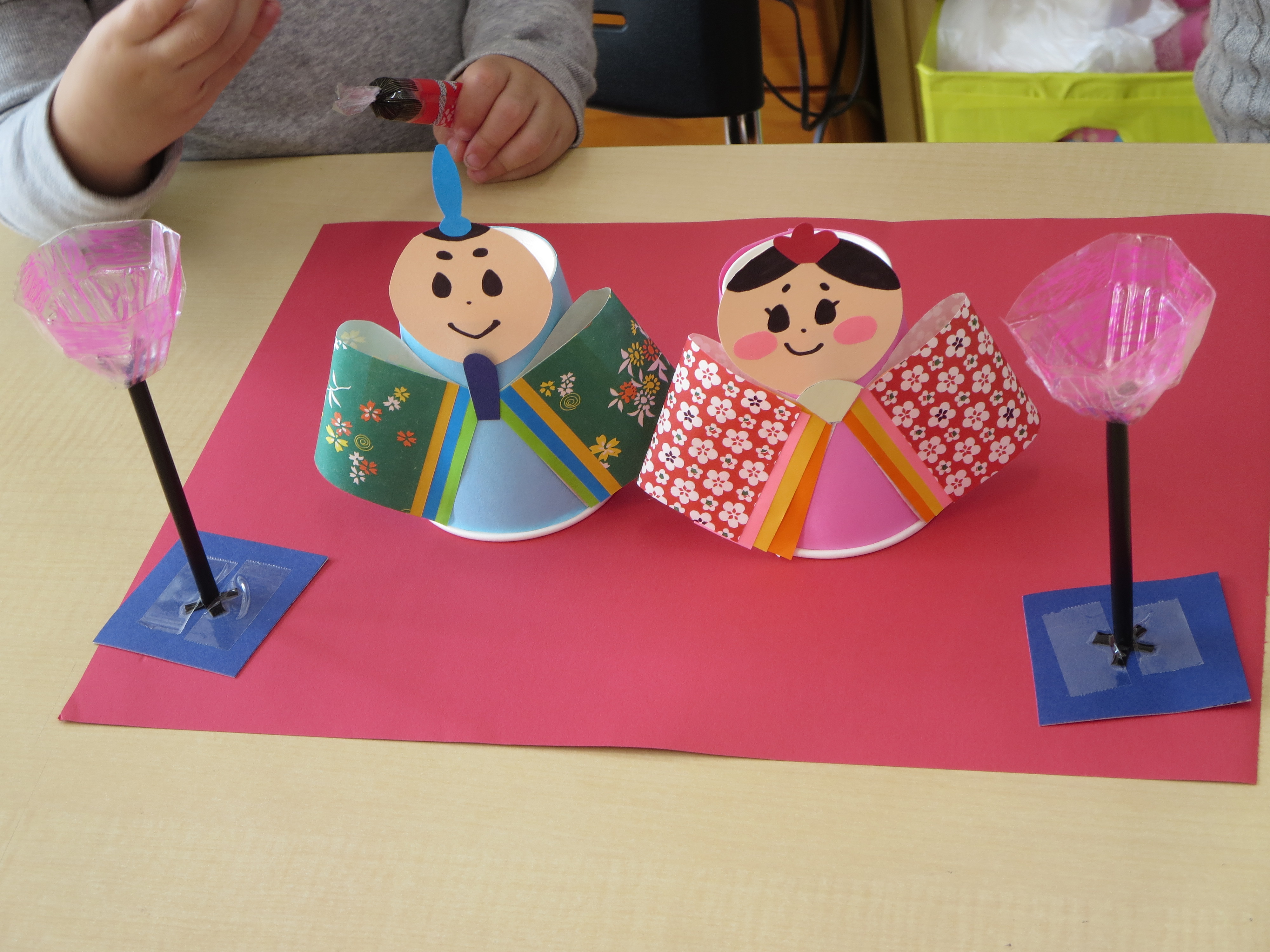 ぼんぼり(左右ふたつ作る) 8)卵ケースの卵1つ分を切り取る。 9)内側をピンク色のマジックで塗る。 10)9)の底にストローが通るくらいの穴をあける。 11)ストローの両先に切り込みを入れ、広げる。 12)10)の穴にストローを通し、テープでとめる。 13)反対側もストローを広げて、画用紙につける。 14)赤色の画用紙の上に、おびなとめびなを飾り、ぼんぼりを横に飾る。