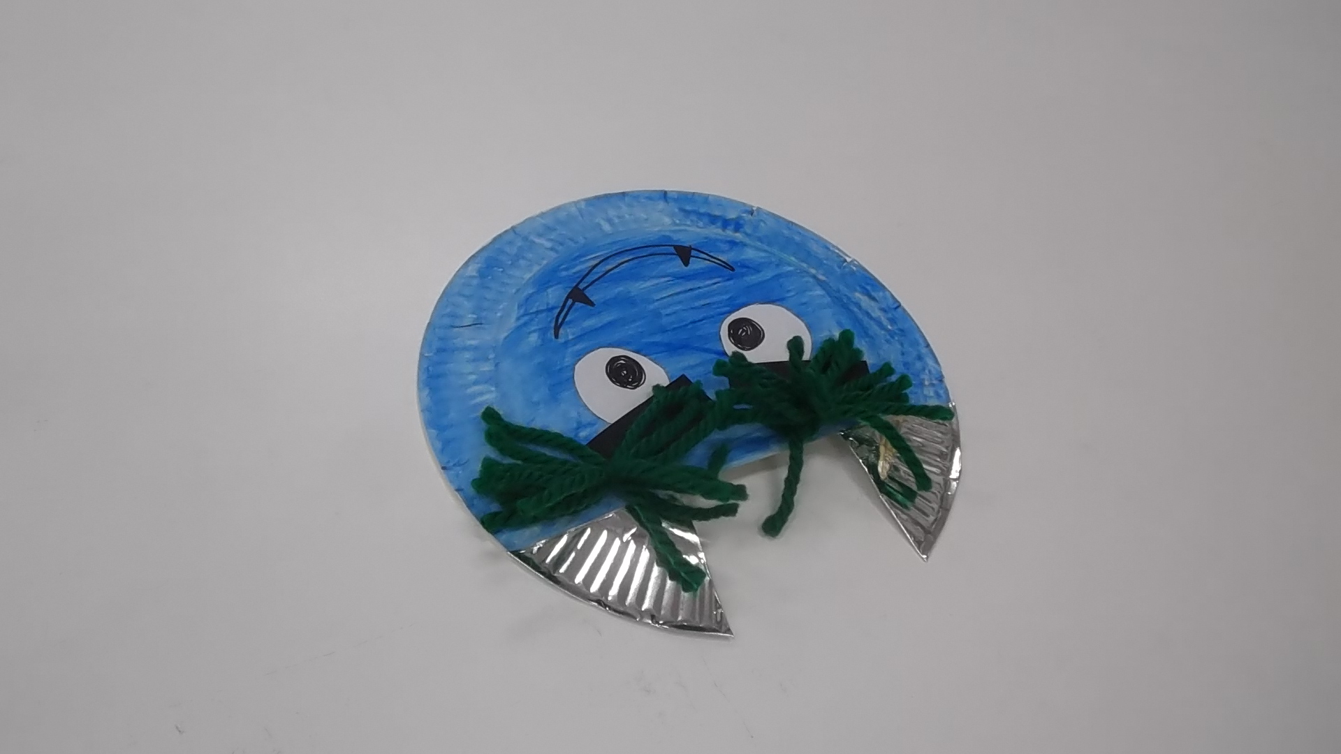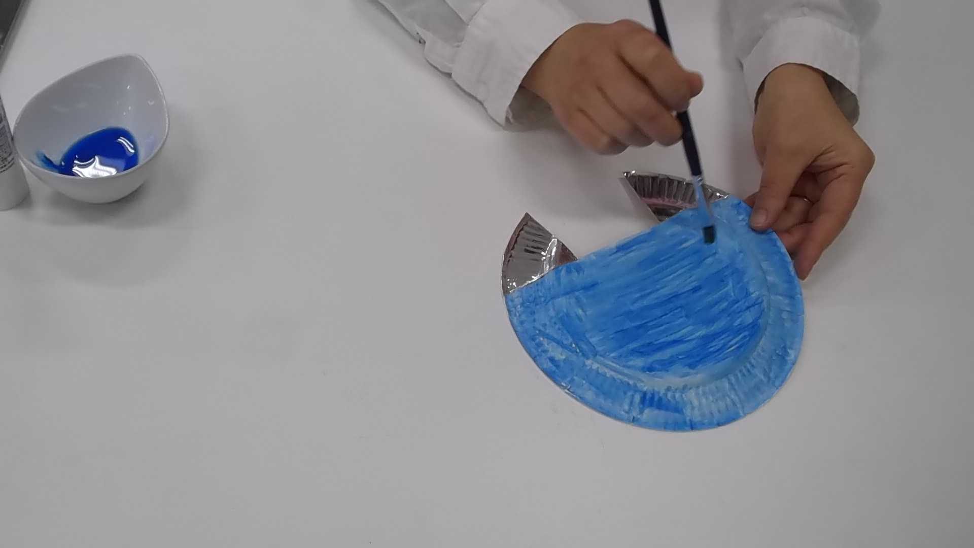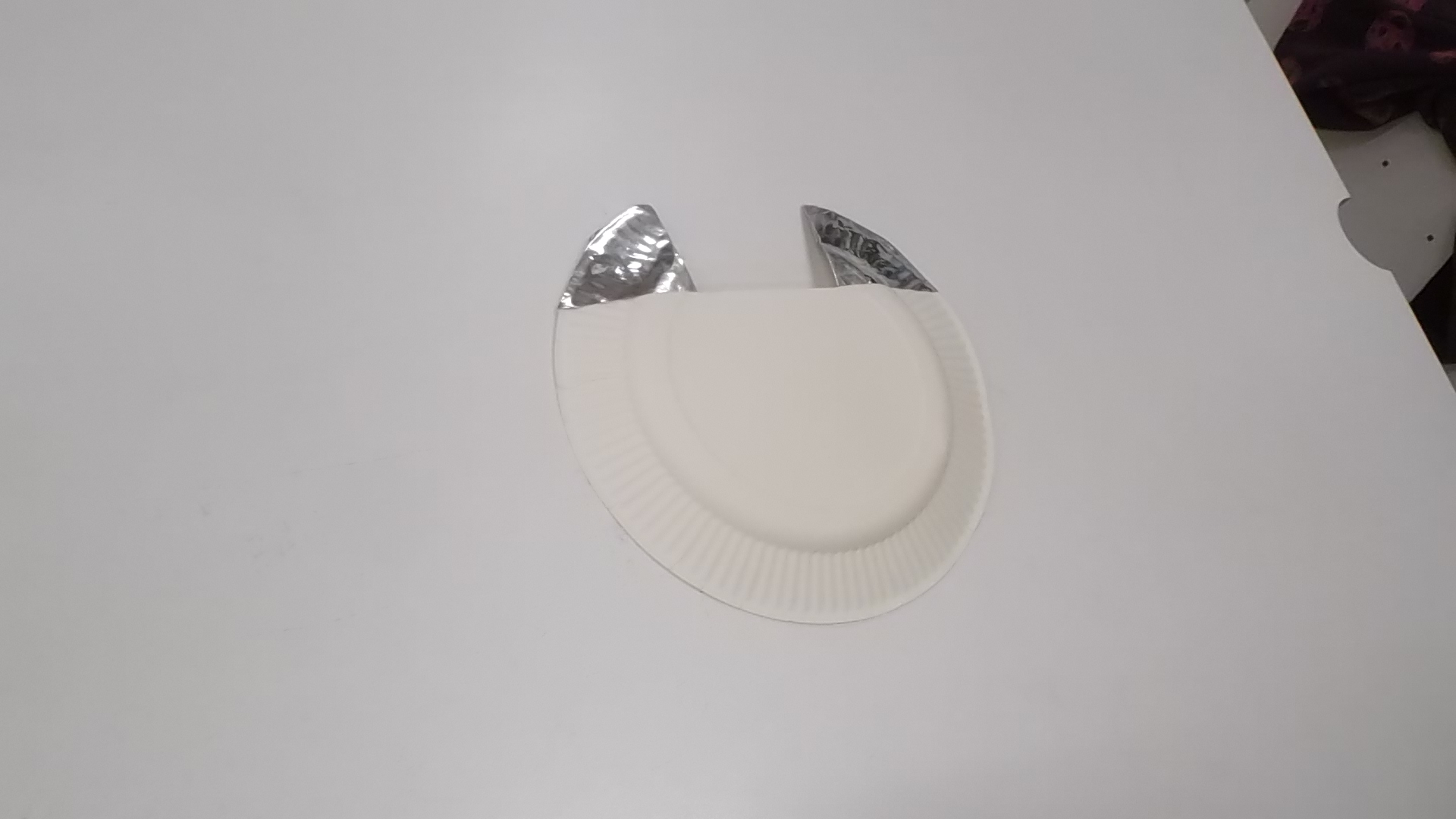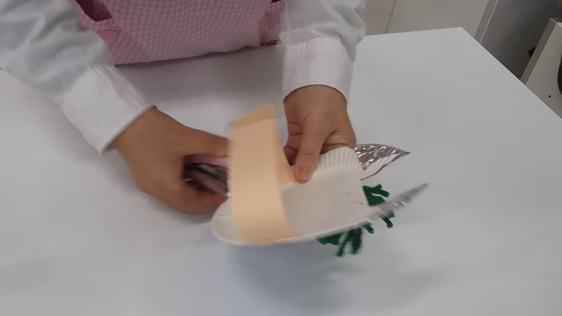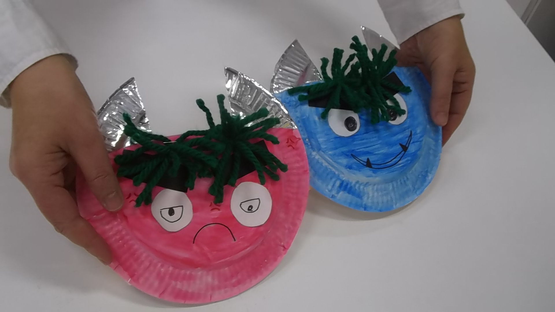 1)紙皿の一か所を切とり、両端が鬼の角になるようにする