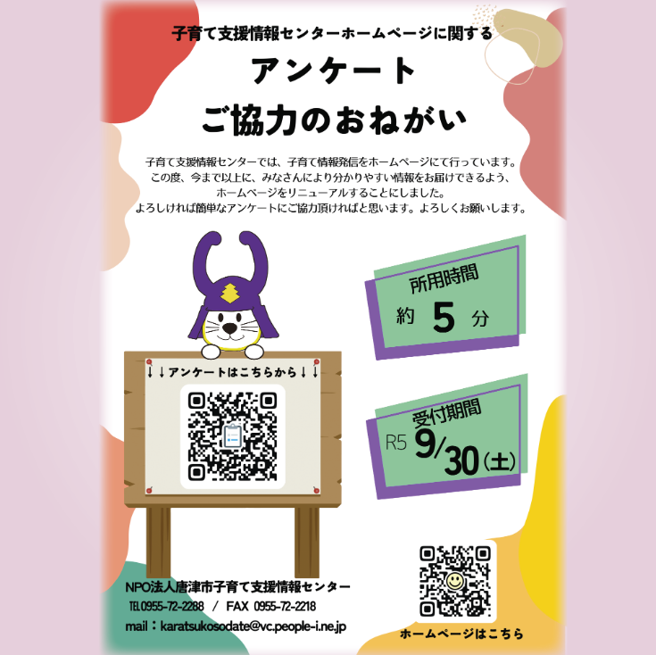 子育て支援情報センターホームページに関するアンケートご協力のおねがい子育て支援情報センターのホームページに関するアンケートご協力のおねがいです。現在もみなさまにご利用いただいております、子育て支援情報センターのホームページを、より分かりやすい情報をお届けできるよう、リニューアルすることになりました。妊娠中やや子育てに関することで、どんな情報が欲しいのか、皆さんのご意見をお聞かせいただければと思います。よろしくお願いいたしますm(__)m ☆★アンケートはこちらから☆★