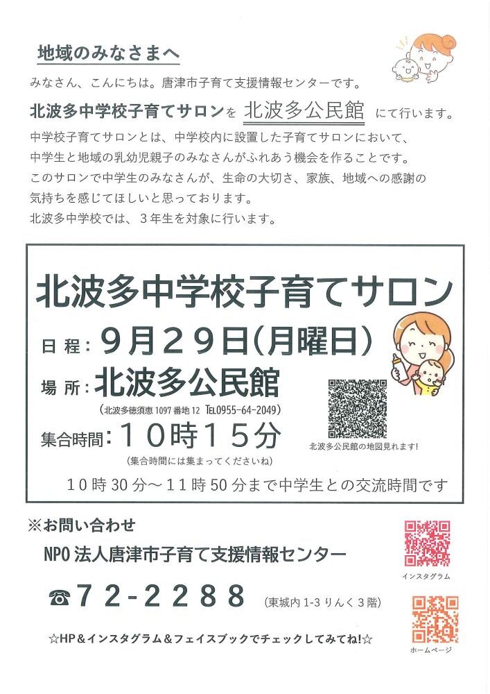 ☆北波多中学校子育てサロン☆を行います。 子育てサロンに遊びに来ませんか? 北波多公民館内に設置した子育てサロンにおいて、地域の乳幼児親子のみなさんと中学生がふれ合う機会を作っています(^^♪ 日 時:令和7年9月29日(月曜日) 3時間・4時間目 10:30分から11時50分まで ☆集合時間 10時15分 場 所:北波多公民館 お問合せ・申し込み 唐津市子育て支援情報センター TEL:0955-72-2288
