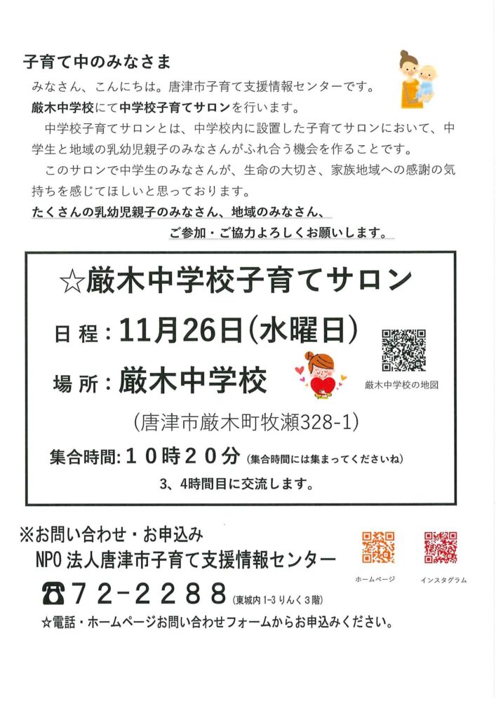 ☆厳木中学校子育てサロン☆を行います。 子育てサロンに遊びに来ませんか? 中学校内に設置した子育てサロンにおいて、地域の乳幼児親子のみなさんと中学生がふれ合う機会を作っています(^^♪ 日 時:令和7年11月26日(水曜日) 3時間・4時間目 10:35分から12時10分まで ☆集合時間 10時20分 場 所:厳木中学校 お問合せ・申し込み 唐津市子育て支援情報センター TEL:0955-72-2288