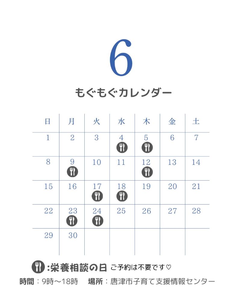 6月のもぐもぐカレンダー☆栄養相談の日になります♪ご予約は不要です☆9時から18時までになります。 こんなご質問をよくいただきます。〇離乳食の始め方〇離乳食の進め方〇何歳から大人と同じご飯?〇急に食べなくなったけど、どうしたらいい? ご飯のことなどなんでもご相談ください♪お待ちしております。 駐車場が満車の場合は近隣の有料駐車場をご利用ください。 ご不明な点がございましたら、0955-72-2288 ゆっくりんまでお電話くださいね。