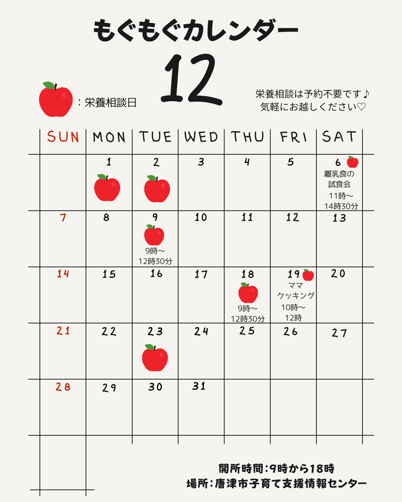 12月のもぐもぐカレンダー☆栄養相談の日になります♪ご予約は不要です☆9時から18時までになります。 こんなご質問をよくいただきます。〇離乳食の始め方〇離乳食の進め方〇何歳から大人と同じご飯?〇急に食べなくなったけど、どうしたらいい? ご飯のことなどなんでもご相談ください♪お待ちしております。 駐車場が満車の場合は近隣の有料駐車場をご利用ください。 ご不明な点がございましたら、0955-72-2288 ゆっくりんまでお電話くださいね。