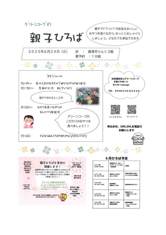 ご予約は社会福祉法人グリーンコープ子育てサポートセンターwatage ☎080(3483)2529 【代表 内山】にお願いします。