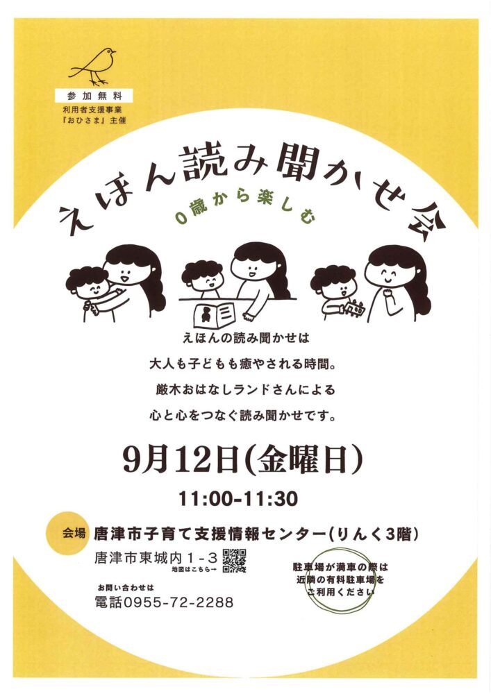 絵本の読み聞かせに参加しませんか?厳木おはなしランドさんによる素敵な絵本の読み聞かせ2025年7月12日(金)11:00~よりりんく3階フリースペースにて開催します大型絵本、エプロンシアター、指人形、歌遊びなどなどいろんな絵本の魅力をたくさーん堪能できますよぜひ親子でりんく3階に遊びにきてくださいね! お問い合わせ先:唐津市子育て支援情報センター電話 0955-72-2288 りんくの駐車場が満車の場合は、近隣の駐車場をご利用ください
