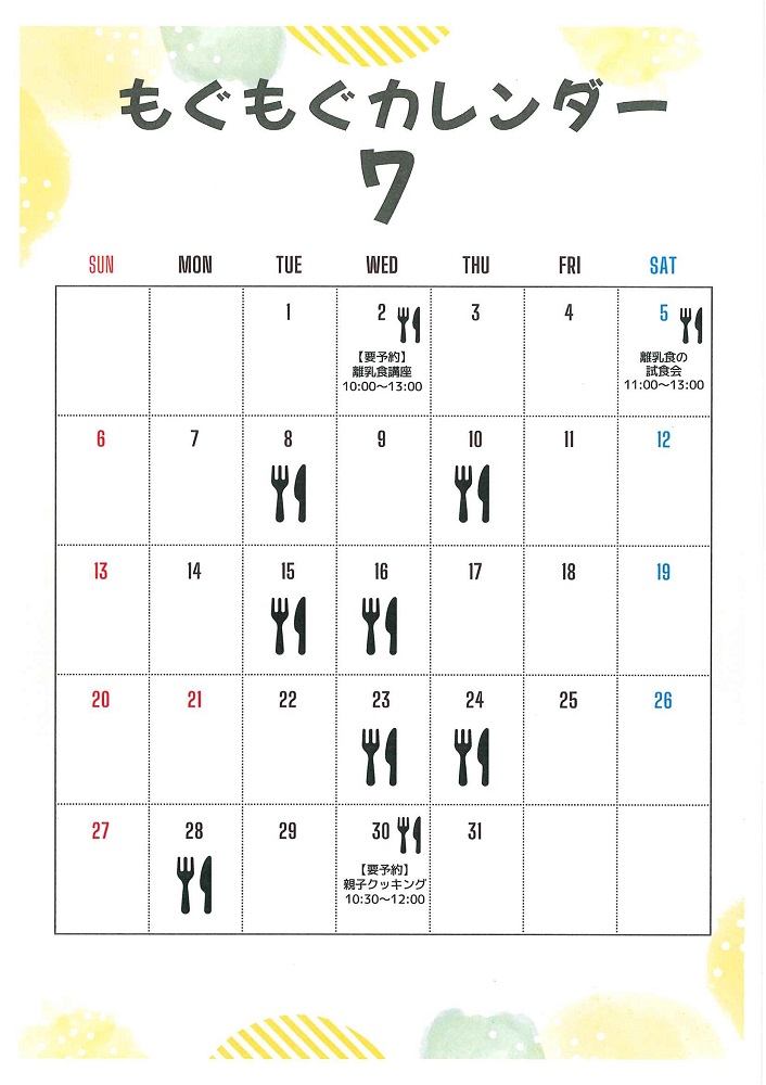 7月のもぐもぐカレンダー☆栄養相談の日になります♪ご予約は不要です☆9時から18時までになります。 こんなご質問をよくいただきます。〇離乳食の始め方〇離乳食の進め方〇何歳から大人と同じご飯?〇急に食べなくなったけど、どうしたらいい? ご飯のことなどなんでもご相談ください♪お待ちしております。 駐車場が満車の場合は近隣の有料駐車場をご利用ください。 ご不明な点がございましたら、0955-72-2288 ゆっくりんまでお電話くださいね。
