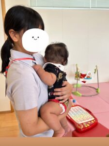 センターの各部門の取り組みを学んでもらったあと、赤ちゃん人形を使ってのお世話体験後に実際に来所された赤ちゃんを抱っこする支援へ。最初は緊張していた中学生も、後半は笑顔で来所された親子のみなさんに接することができていました。