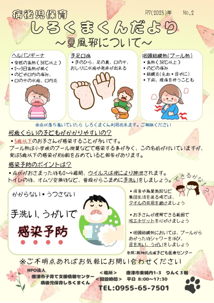 しろくまくんだよりNO2病後児保育しろくまくんです。しろくまくんだよりNo.2を作成しました。今回のテーマは「夏風邪について」ですプールや海、川など水遊びが気持ちいい時期になりましたね。楽しく夏を乗り切る為にも感染対策しっかりして過ごしましょう