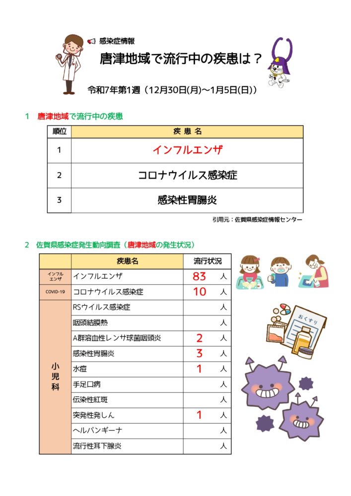 唐津地域の最新の感染症情報(第1週)です。病後児保育しろくまくんです。新しい1年が始まりました。唐津市では年末に比べると全体的に感染症が落ち着いてきているようですが、まだまだインフルエンザは多くみられます。2025年も皆様にとって素敵な1年となりますように。今年もどうぞよろしくお願いいたします。