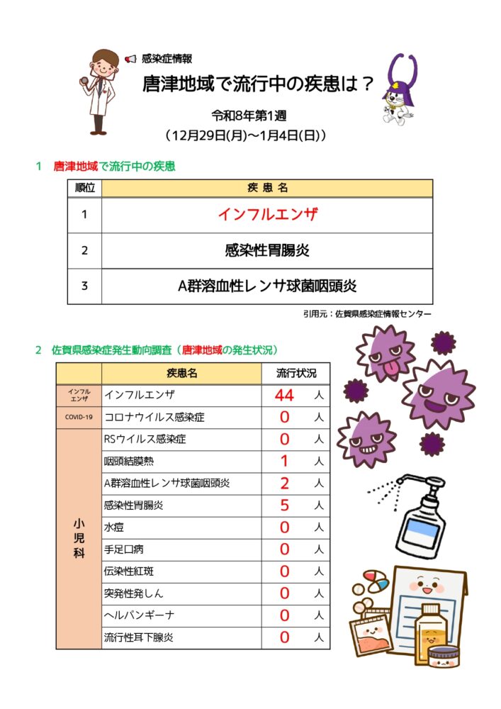 唐津地域の最新の感染症情報(第1週)です。最新の感染症情報をお知らせします。冬休み期間のインフルエンザの発生は減っていますが、新学期が始まりましたので、引き続き体調管理にご注意くださいね。こまめな手洗い、咳エチケットで かからない! うつさない!
