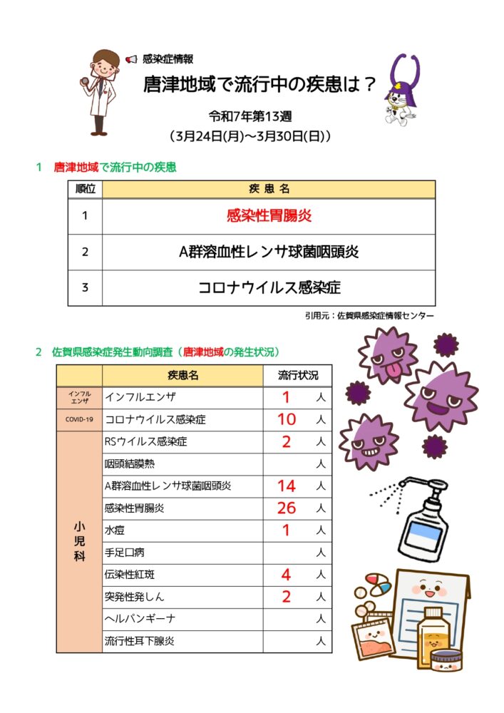 唐津地域の最新の感染症情報(第13週)です。病後児保育しろくまくんです。最新の感染症情報をお知らせします。今週も感染性胃腸炎が最多でした。新学期が始まりましたね。新たな環境で体調も崩しやくすなるので皆さん気を付けてお過ごしください