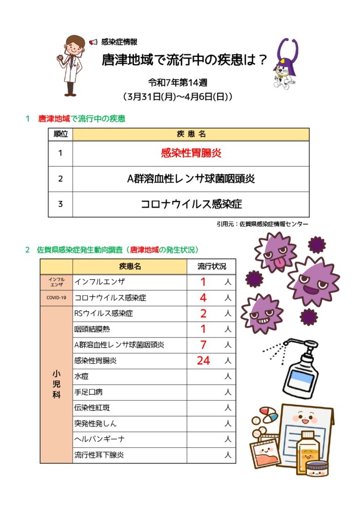 唐津地域の最新の感染症情報(第14週)です。病後児保育しろくまくんです。最新の感染症情報をお知らせします。今週も感染性胃腸炎が最多でしたが全体的に感染症が落ちているように感じます。温かくなってくるので体温調節しやすい服を着たり、こまめな水分摂取を心掛けてお過ごしください