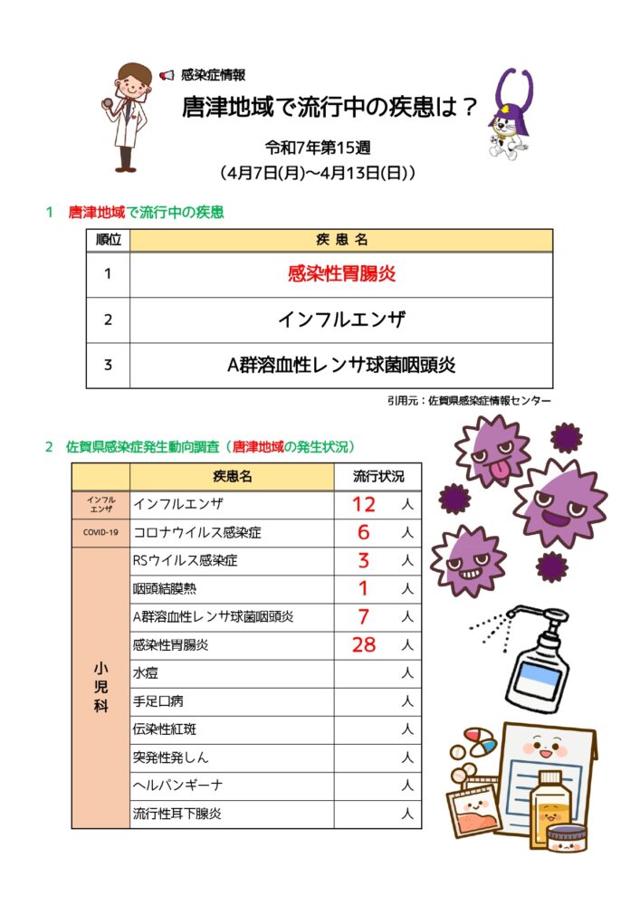 唐津地域の最新の感染症情報(第15週)です。病後児保育しろくまくんです。最新の感染症情報をお知らせします。今週も感染性胃腸炎が最多でしたがインフルエンザが流行しています。乾燥していたら加湿しつつ、手洗いうがいをして体調管理を行ってくださいね!