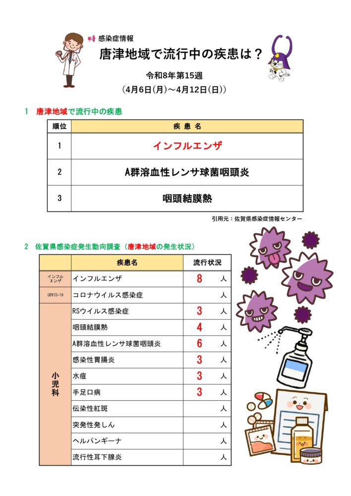 唐津地域の最新の感染症情報(第15週)です。最新の感染症情報をお知らせします。感染症の全体の数が落ち着いてきていますが、新しい環境になり、体調を崩されて病後児保育しろくまくんを利用される方が増えてきています。お困りの際はお気軽にご連絡くださいね。