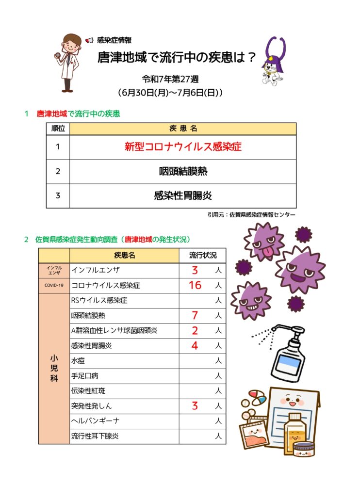 唐津地域の最新の感染症情報(第27週)です。最新の感染症情報をお知らせします。 コロナウイルス感染症が再燃しています。暑い日が続き、エアコンの効いた締め切った部屋にいることも多いと思いますが、適宜換気も行いながら過ごしましょう!