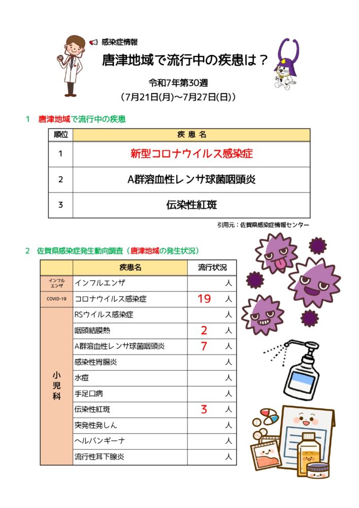唐津地域の最新の感染症情報(第30週)です。最新の感染症情報をお知らせします。今週もコロナウイルス感染症が最多でしたが先週よりは少し減ったように感じます。夏の行事を楽しむ為にも、皆さん体調管理に気を付けて