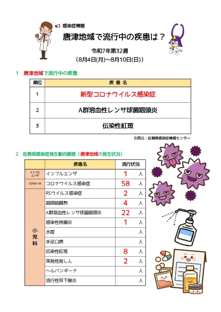 唐津地域の最新の感染症情報(第32週)です。最新の感染症情報をお知らせします。暑い日が続いていますが、体調はいかがですか?感染症や熱中症にならないためにも、しっかり休息や栄養をとって体力をつけて、まだまだ夏を楽しみましょう✨