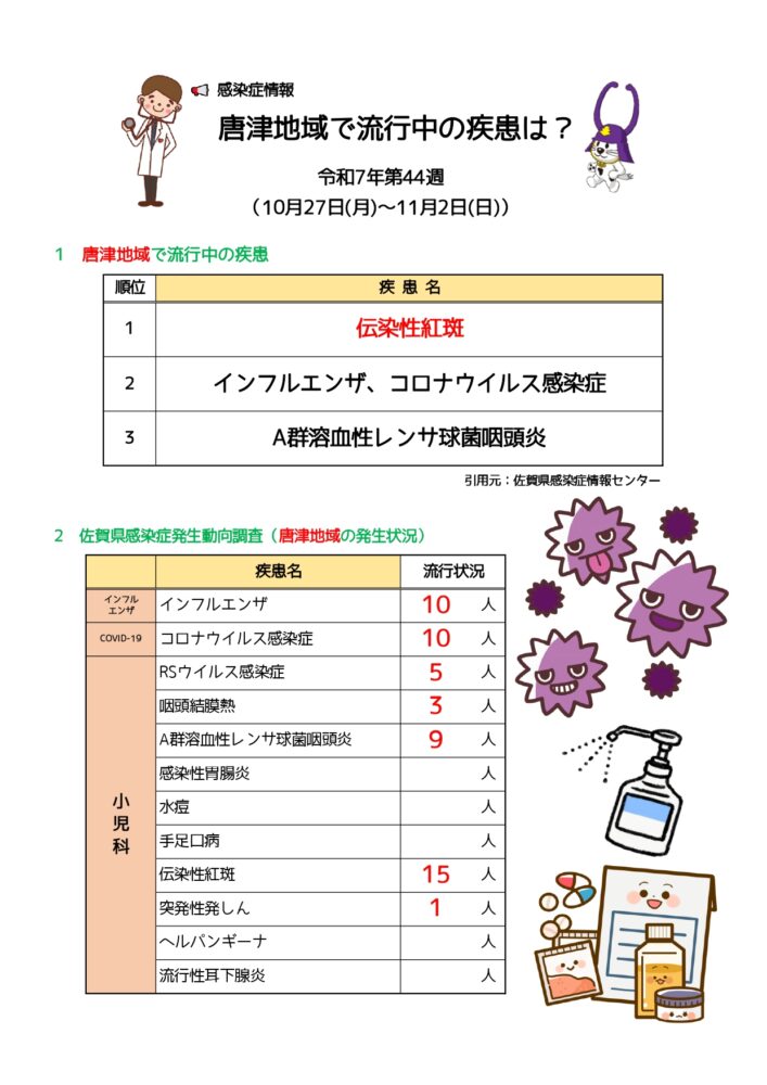 唐津地域の最新の感染症情報(第44週)です。最新の感染症情報をお知らせします。唐津くんちはいかがお過ごしでしたか?唐津くんち後は特に体調を崩す方が多いです。また、唐津市にもインフルエンザ罹患者が発生しています。しっかり睡眠をとり体調回復するように気を付けてくださいね。