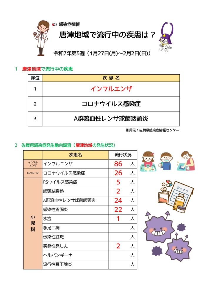 唐津地域の最新の感染症情報(第5週)です。病後児保育しろくまくんです。最新の感染症情報をお知らせします。今週もインフルエンザが最多で胃腸炎や溶連菌感染症も多めでした。低温、乾燥などウイルスの好む気候が続いてますね。立春は過ぎましたが春はまだ先かな~?温かくしてゆっくり休める時は休息をとりましょう。